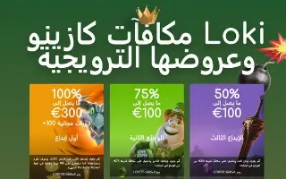 عرض ترحيب: يمنح الكازينو كل لاعب جديد ينضم إليه ويقوم بأول إيداع لا يقل عن 20يورو، مكافاة ترحيبية تصل إلى 300 يورو ومعها 100 لفة مجانية. المكافاة تشمل اول ثلاثة ودائع. بعد اول إيداع مكافاة تصل إلى 300 يورو مع 100 لفة مجانية، يتطلب ادخال الرمز الترويجي LOKI100.